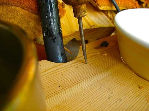 Entre la Copa y el plato empuje cuatro agujeros en la madera, con la lezna y ajuste de los radios.