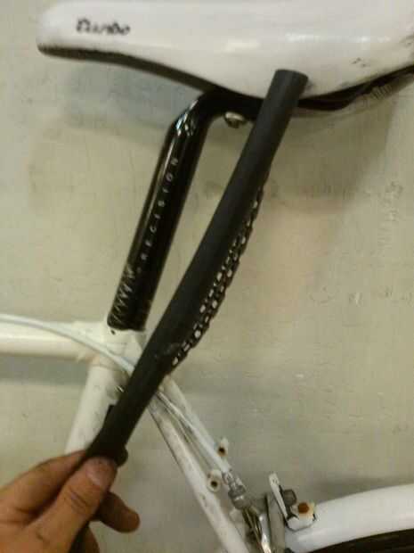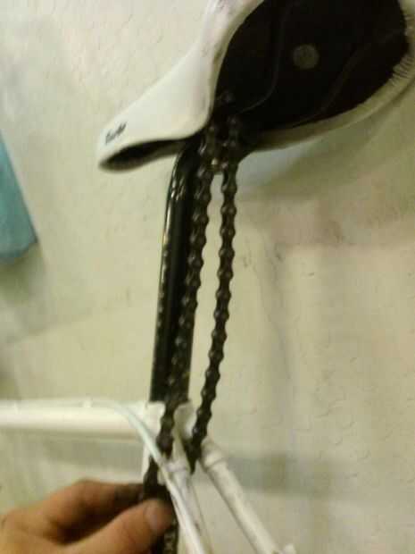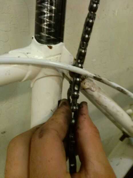 En este punto, cortar algunos innertube. Esto también está bien dejar unas pulgadas largo - corté la cámara donde están los dedos, que se puede ver son unas cuantas pulgadas debajo de donde la cadena se envuelve alrededor del triángulo trasero.