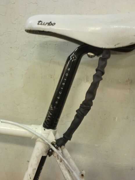 Nota: Con el tiempo la cadena probablemente usará la pintura de tu moto. Para otro de estos que hice hace un tiempo, corte una raja en el tubo y enlazado de alguna manera el tubo de nuevo en sí mismo, para que el tubo estaba entre la cadena y el marco. Era un poco como una botella de Klein. Ya ha pasado un tiempo y no recuerdo como hacerlo, pero es posible.