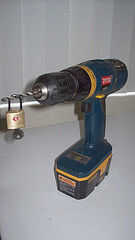 Taladro, pedacito de taladro y una cerradura del equipaje.