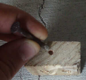 Obtener el bloque pequeño de madera y golpee el clavo unos 3mm en la mitad de lo que hace una pequeña abolladura.