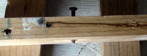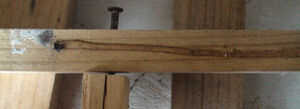 Extraiga el clavo y grifo por el orificio original nos hacen y luego la línea hasta la otra pieza de madera con la abolladura como guía, pulse la uña completamente en ambas piezas de madera para fijar, puede avellanar el clavo en esta etapa si quieres.