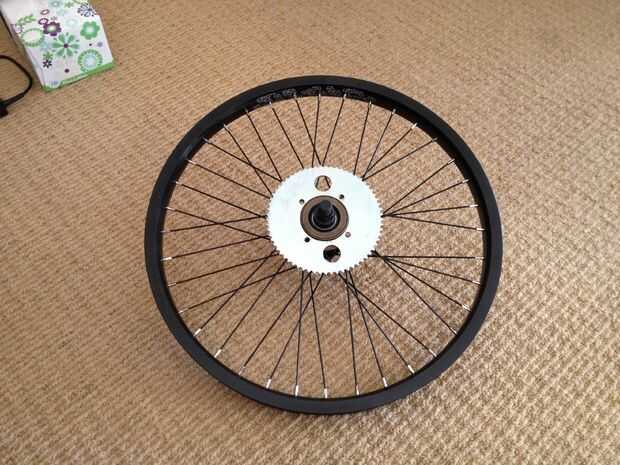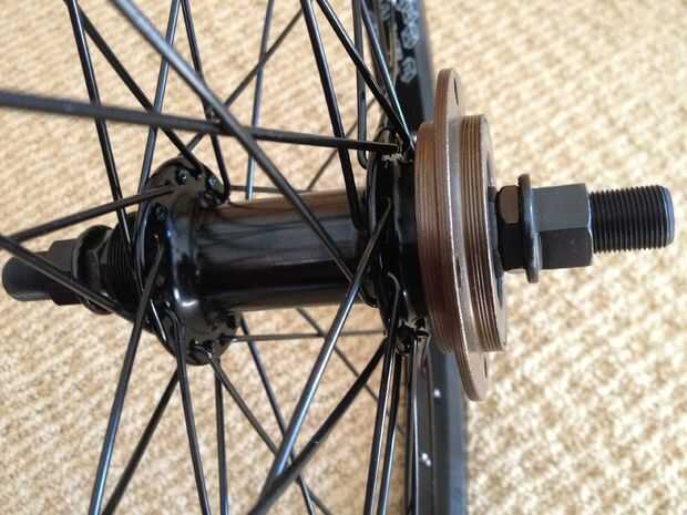 Esto puede de difícil, pero con un poco de investigación, generalmente usted puede encontrar un centro que tiene la rosca en ambos lados permitiendo un piñón en la izquierda y derecha. Porque el hilo es tanto mano derecha, necesita hacer una llave en el lado izquierdo de la llanta para no desenroscar. Presentó una pequeña muesca en la rueda libre, roscado, y y una forma de c en el centro donde se sentaba la muesca. Yo a continuación, corte el extremo sólido del taladro había mordido y había utilizado como clave como se puede ver asomando en la fotografía. El piñón, cadena y piñón fueron todos de tncscooters y cuesta unos 30$.