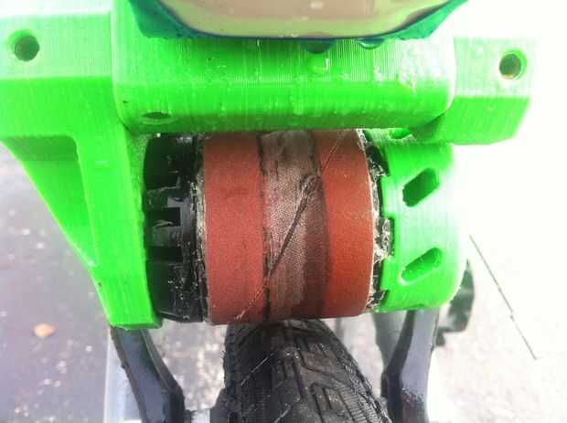 Oh la ironía terrible, hice este gran juguete y recientemente se mudó a una de las ciudades más bici-capaz en los Estados Unidos y el noroeste del Pacífico es un lugar muy húmedo para vivir! El BoosterPack diseño se basa en la fricción y es incapaz de función en un neumático de bicicleta mojada. Por lo que he probado diferentes granos de lija, recubrimientos, mallas y recubierto de goma retráctil pero mi conclusión es que cualquier material capaz de agarrar un neumático mojado rápidamente se desgastan la llanta (o llevarse rápidamente) cuando el neumático está secado.