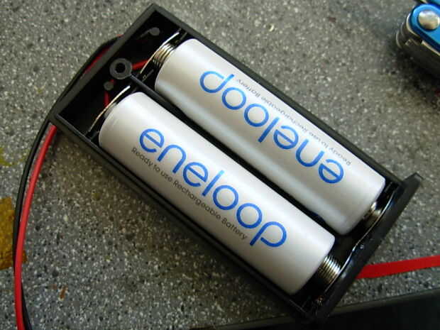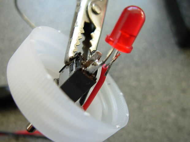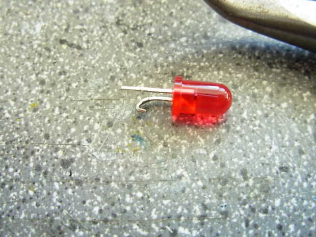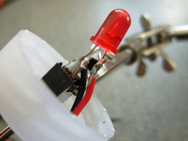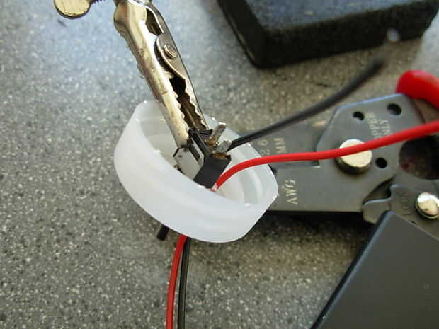 Después de tirar de los cables a través, de la soldadura a una ficha en el interruptor. Cortar los cables del LED y dobla uno para ganchos agujero de la ficha otros continuación, en la soldadura. El otro cable desde la caja de la batería irá directamente a lo LED. Después de efectuar el cableado, prueba el circuito para asegurarse de que su LED parpadea correctamente. Si funciona, vaya al paso siguiente. Si no, examine el circuito y conexiones individuales para solucionar el problema.