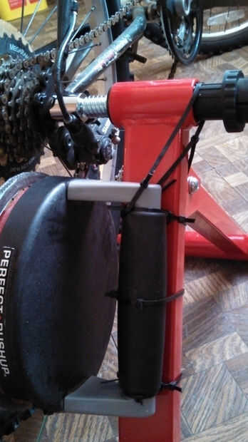 Cubrir la parte posterior del soporte del wiimote con doble cinta adhesiva y fije a la superficie de lo pushup, asegurándose de que esté centrado. Utilicé zipties extras entre el entrenador y el pushup pellizcar los lazos en mantener la manilla centrada. La parte superior la mayoría amarra está ahí para evitar todo deslizamiento hacia abajo de la estructura. Es realmente muy sólido de esta manera, pero cualquier otro método también está muy bien.