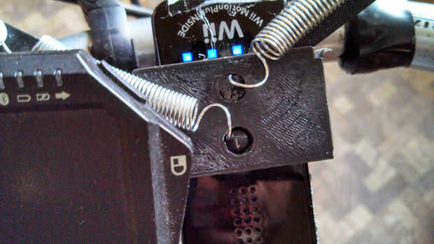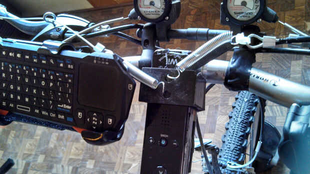 Este wiimote maneja los datos de dirección y frenado. Probablemente tenga que ser creativo aquí con el montaje como bicicletas pueden ser muy diferentes. Sólo detecta la inclinación y dirige por consiguiente izquierda/derecha.