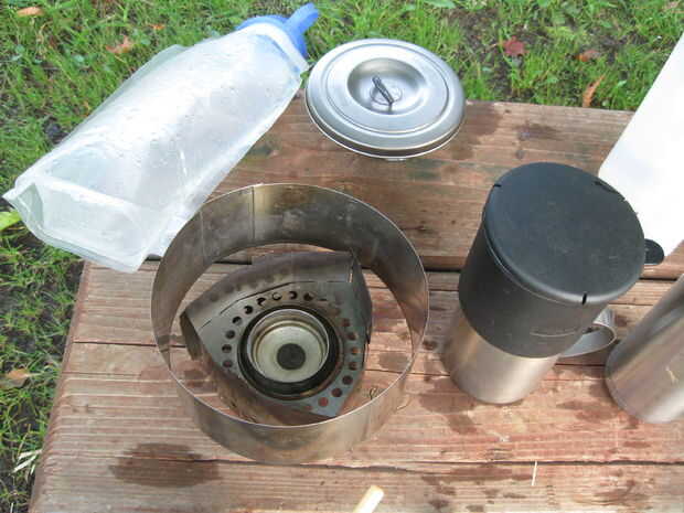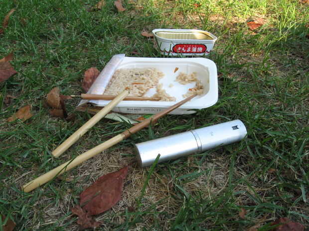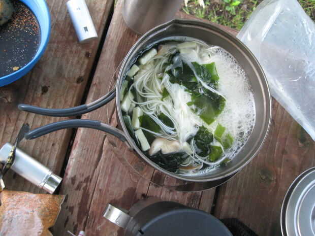 Tenía un pequeña estufa del alcohol, así que hice somen sopa para el desayuno y cena - uso seca wakame (alga marina), queso de soja y todo lo que tenía en mano. También comí arroz instantáneo y una lata de pescado durante el día alrededor de 700 calorías por 200 yenes, complementados por las porciones de frutos secos, pasas, plátanos secadas y chocolate.