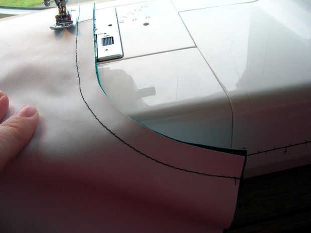 Coser la costura de la entrepierna y reforzar (figura dos). Usé una falsa costura plana talados porque real flat-talado son especie de complicado en las curvas. Doblar y coser los bordes crudos de outseams y entrepiernas (cuadro 3). Nota que no estoy terminando los bordes ya que Gore-Tex tiene un mínimo desgaste.