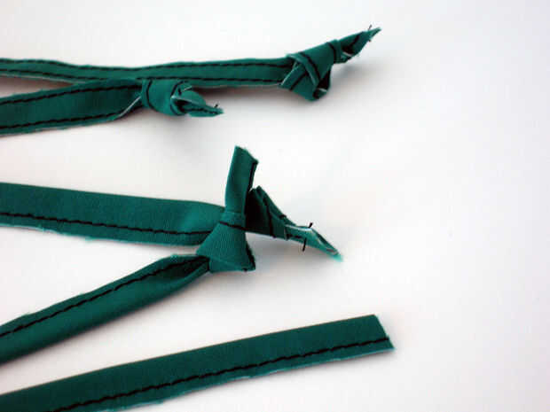 Construir lazos: topstitched 1/4 canales en el 1" corte de las tiras laterales mal juntos y con cuidado cerca de las costuras (cuadros 4 y 5). Cortar cuatro tiras de 10" con lazos y anudar los extremos.