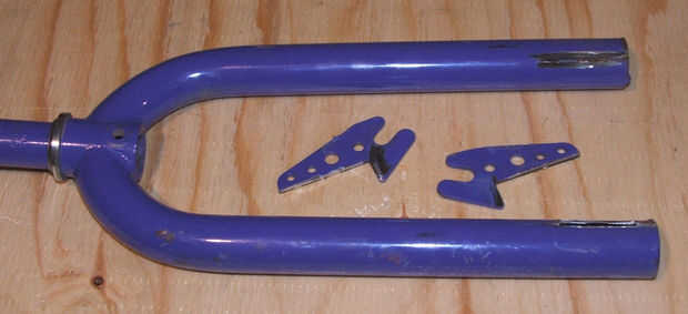 Antes de agregar más a la moto, me decidí a trabajar en la horquilla delantera. La horquilla delantera será un conjunto típico de las horquillas de tubo redondo BMX (foto 11), corte y extendido a algunos longitud mediante conducto eléctrico amurallada delgada de 1 pulgada. La primera cosa a hacer era cortar a las punteras de la horquilla, ahorrando tanto del metal como sea posible ya que volverá a colocarse en las horquillas nuevas.