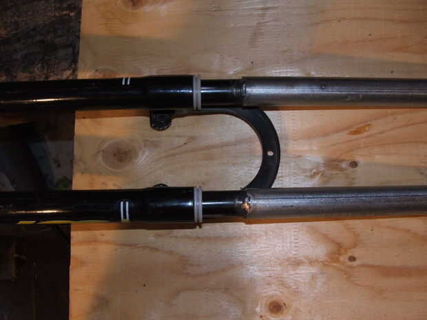 Ahora que la parte superior de las horquillas se sueldan a los tubos de extensión, repita el proceso con la parte inferior de la horquilla. Dado que la mitad inferior contiene la suspensión, asegúrese de dejar suficiente espacio por encima de la parte móvil de las horquillas para viajar - en estas bicicletas de montaña baratas, no se trata de más de 2 pulgadas. También, soldar una pulgada o tan en un momento y deje que se enfríe el área. Hay piezas de plástico dentro de la manga utilizada como superficies para la parte corrediza de la horquilla del cojinete.