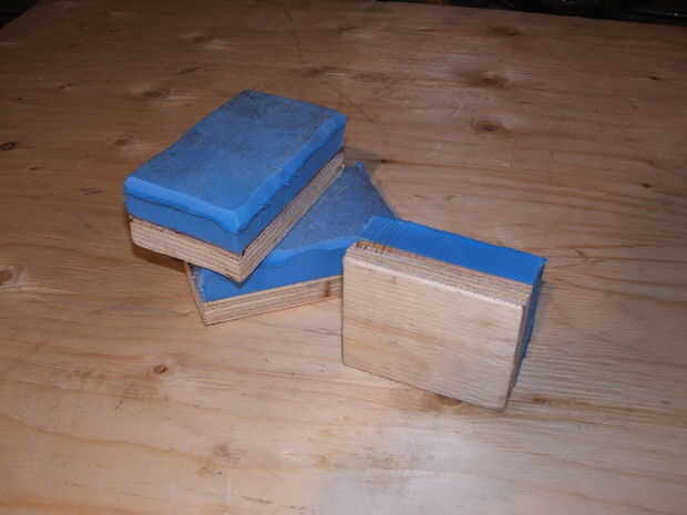 Para probar algo un poco diferente, el acolchado del asiento se hará de tres bloques pequeños. Los bloques se hacen pegando algunos espuma de 2 pulgadas a unos cuadrados de madera contrachapada de 3/4 de pulgada. Aunque el relleno será mínimo, todavía pega un asiento de bicicleta típica que tiene un área superficial más pequeño aún y casi ningún relleno en todos. Asientos "Wedgie" son malos!