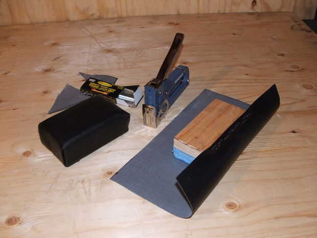 Se hace la cubierta de asiento de la más alta calidad vinilo material dinero puede comprar - en este valor de caso $3. Porque los bloques de asientos son cuadrados, usted tendrá que envolver el material alrededor como si fueron envolviendo un regalo en caja. Estirar el material lo mas ajustado posible y grapa en dos lados, luego plegar las otras dos esquinas y hacer lo mismo. Este método no es tan bonito como una funda totalmente cosida, pero no tengo una máquina de coser en mi garage, ¿te?