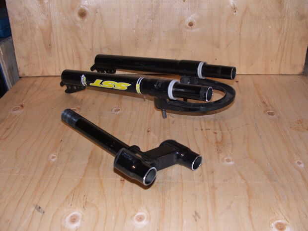 Para que este interruptor para convertirse en una bestia digna, se decidió que mantener la suspensión delantera en el tacto sería una buena idea. La horquilla delantera se cortaron justo debajo de la corona para dejar alrededor de 1-pulgada de tubería detrás de. La razón de esto es porque planeé sobre el uso de tubo de 1 pulgada para extender las horquillas, y por casualidad, el diámetro externo del tubo de la pierna horquilla original encaja perfectamente en el conducto - ninguna alineación necesaria!