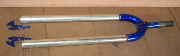 Las dos longitudes de conducto se insertará en la horquilla como se muestra en la foto 8. Poner todo en su lugar y hacer que ambos tubos de extensión de pierna horquilla terminan de la misma longitud, o su rueda delantera no se centrará fácilmente.