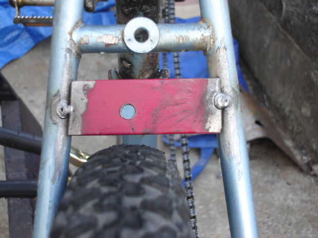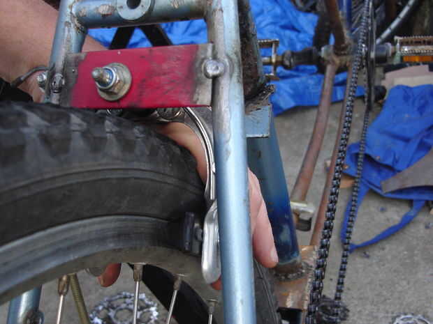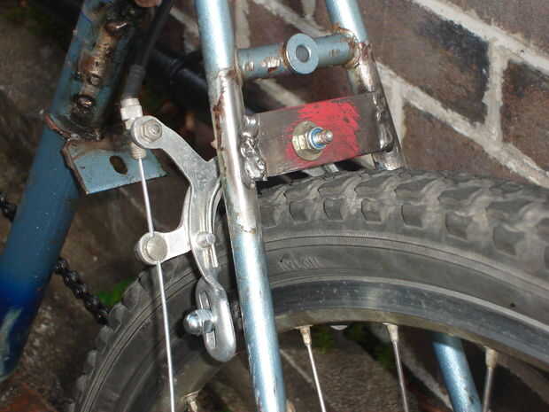 Cuadro 1: trabajé donde la pinza del freno tenía que montarse y tachuela-soldó con autógena una sección de la placa a través de las vainas traseras. Tenga en cuenta que el agujero de montaje no es central, esto es debido a errores en la alineación de mi marco.