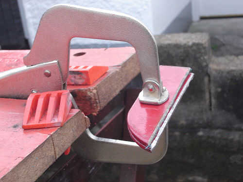 Fig 5. Fije las dos piezas juntas y corte las ranuras para el eje de la rueda. Esta manera, usted puede estar seguro de que al utilizar una amoladora para cortar las ranuras, las ranuras de ambos será idénticas. Tómese su tiempo aquí - no cortar demasiado de usted a riesgo la rueda saltando. Tu objetivo es cortar una ranura sólo lo suficientemente grande como para el eje de la rueda caber comodamente. Seguir tratando de encajar el eje de las ruedas en las ranuras hasta que encajen justo. Es necesario un ajuste apretado - no pierda forma. (Foto 6)