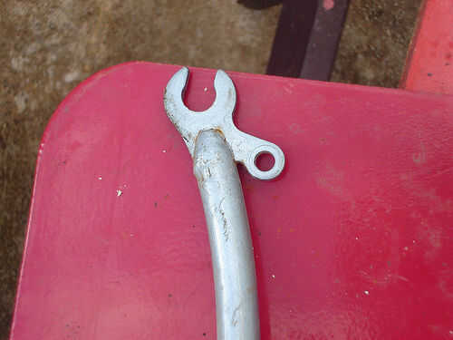 A continuación, tenemos que soldar las punteras de la horquilla. Usé un montaje magnético para sujetar la deserción a la horquilla. IMPORTANTE: Cometí un error cuando soldó con autógena mis abandonos - coloqué justo en el centro del tubo - debo han trasladado los acerca a un borde. Sólo descubrí esto más tarde durante un paseo de prueba cuando los radios de una rueda se roce contra la parte interior de los tubos de la horquilla. Por suerte, pude utilizar otra rueda que mejor, pero ten cuidado de este error!