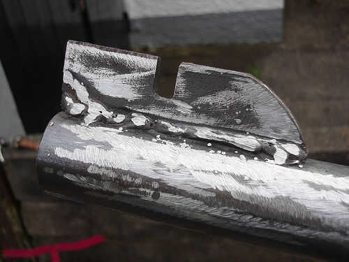 Foto 7. Soldadura de tachuela el abandono a las horquillas. Verifique la alineación. Cuando tu feliz que todo está bien, soldarlo correctamente. Aquí es donde el tiempo necesario para hacer un borde recto vale la pena!
