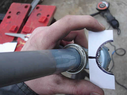 PIC 1. Usando un poco de cartón como plantilla, dibuja un semicírculo alrededor de los tubos de horquilla nuevos. Utilice un marcador para dibujar la forma de las nuevas horquillas en la corona de la horquilla. Use una amoladora para cortar la forma de las nuevas horquillas de la corona. Tómese su tiempo aquí, probar y obtener la forma lo más cerca posible de las nuevas horquillas.