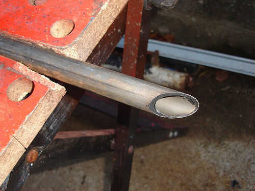Foto 4. Utilice la amoladora para cortar a 45 grados en el extremo del tubo.
