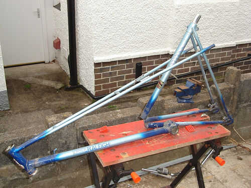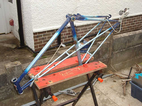 El marco fue picado a que era la caja del pedalier hacia la parte delantera de la moto. A se extiende el marco.