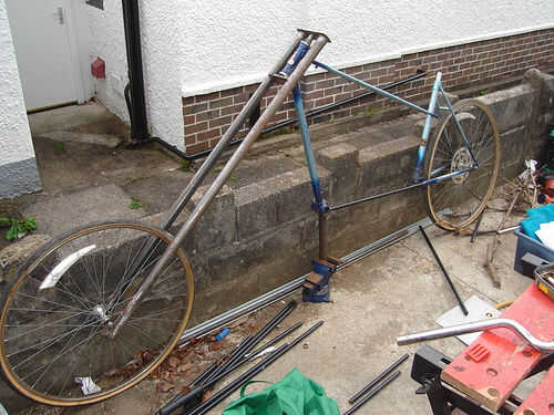 Yo estaba contento con la forma general y el diseño de la nueva estructura, por lo que el siguiente paso fue extender el marco insertando dos nuevos tubos de acero de la caja del pedalier al par inferior de los tubos en la parte inferior de la tija de sillín.