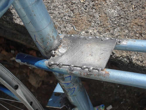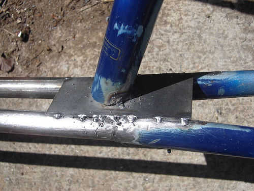 Cuadro 5. Utilizando un trozo de cartón como una plantilla, hice una placa de chapa que colocado debajo del tubo del asiento. Había soldado la placa encima de los tubos horizontales. Esto fortalece la unión entre los dos nuevos tubos y los tubos traseros. Entonces soldó con autógena el tubo del asiento a la placa.