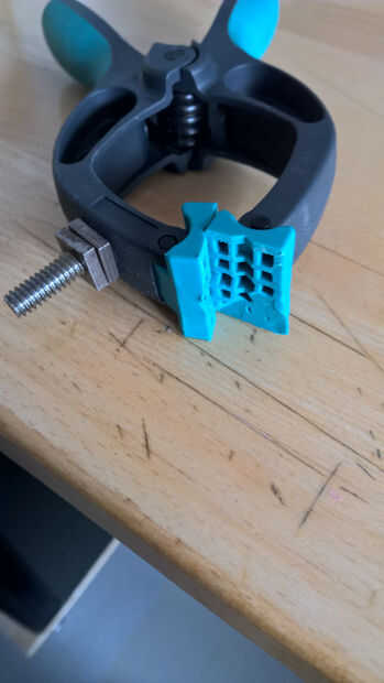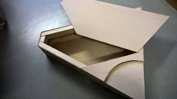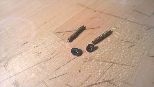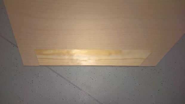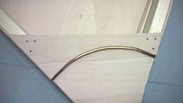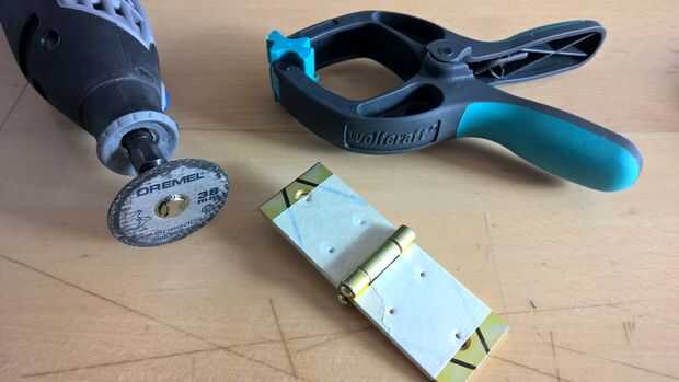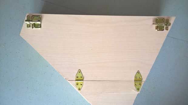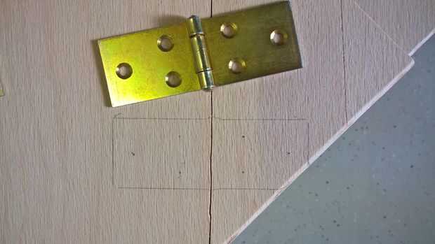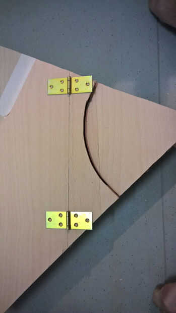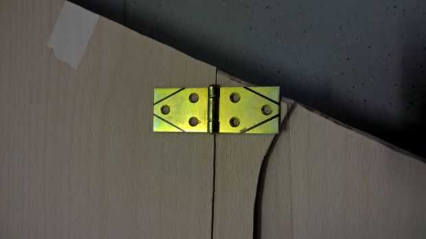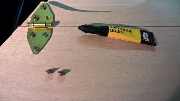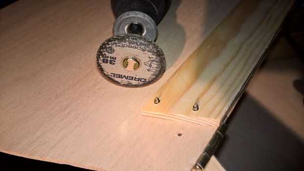 Hice la puerta/mesa de la madera misma como los lados con algún apoyo extra en las bisagras. Coloqué las bisagras en el marco de madera subyacente por lo que podría atornillarlos en el lado inferior. El lado de la puerta/mesa sólo tenía 4mm pensé que no era suficiente para mantener las bisagras de la bruja de madera contrachapada. por lo tanto, pegué algunas madera extra en su lugar para tener algo de espacio para asegurar los tornillos de la puerta. Los tornillos que utilicé para esta parte donde sólo 1,6 cm de largo pero todavía demasiado largo. Corté de utilizando la dremel. porque sólo es posible tener 2 tornillos en la parte inferior pegué tornillos 'falsos' para ocultar los agujeros.