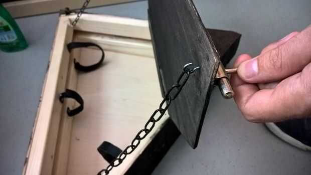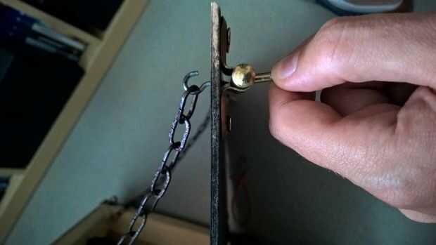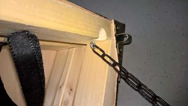 Para mantener la puerta a un ángulo de 90 grados, que usé una cadena porque se ve mejor que un pedazo de cuerda pero estoy seguro que funciona igual de bien! Usé unos pequeños ganchos para sujetar la cadena. En el marco de la usé circuitos cerrados. En la tabla de la puerta he utilizado ganchos abiertos asi puedo modificar el ángulo dependiendo de la superficie que está de pie sobre la bicicleta. Después de colocar los ganchos en la puerta descubrí que no podría cerrar más porque se estaban ejecutando en el marco. Resolví este problema quitando algo de madera en el marco.
