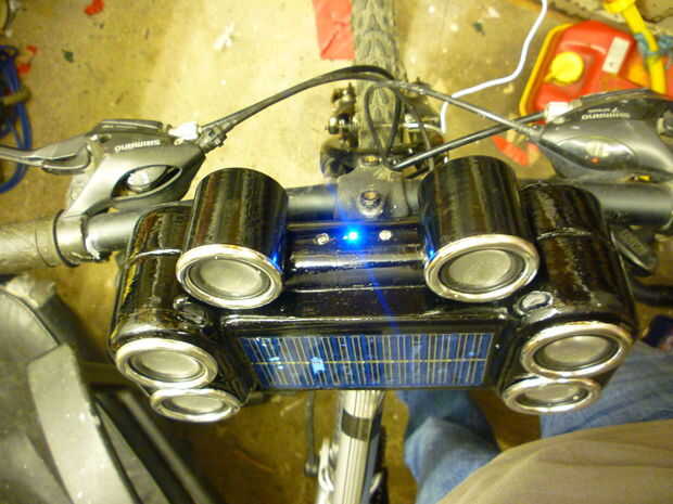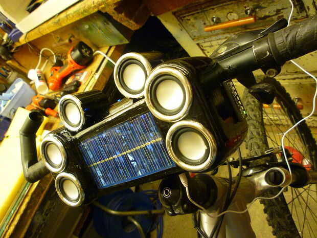 estos altavoces son un combo de esos altavoces de foldup swapmeet que venden para ipods y algunas rescatado de una vieja computadora mac. soporte de la batería es de la primera versión de mis luces de bicicleta y los cables fueron comprados en el sh