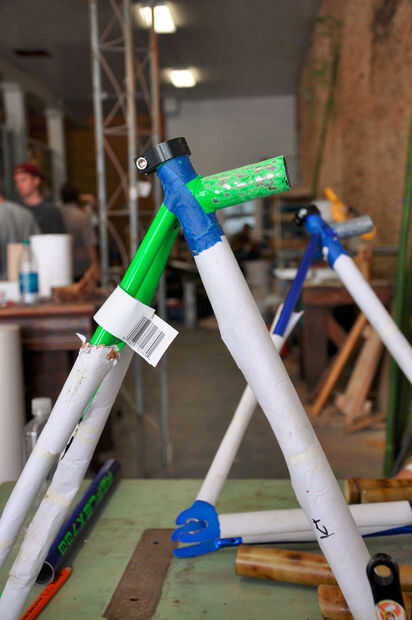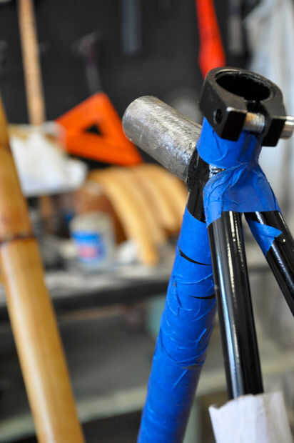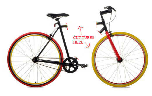 En primer lugar, medir la parte superior y abajo diámetros de tubo. El tubo de abajo va a ser un poco más grande por lo que necesitará hacer los tubos de diferentes tamaños. Se utilizar estas mediciones para calcular el tamaño de su hextubes. A continuación, medir cuidadosamente la longitud del tubo superior y el tubo hacia abajo. Por lo general, longitudes del tubo se miden de centro a centro. De esta forma, al instalar el hextubes no va a cambiar la geometría de la estructura. Utilice un rotulador para marcar los cortes, por lo que sus terminales son 80-100mm de largo, luego vio su marco. Áspero a los "estirones" que irá dentro de nuestro hextubes y apagado el resto del marco para proteger la cinta.