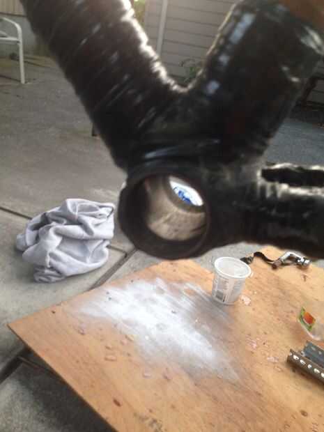 Una vez yo estaba confiado en mi fuerza de marco empecé mano lijar el marco entero con papel de grano arena 60. Lija cada articulación hasta que era bastante bueno, para mis estándares. Asegúrese de usar una mascarilla, mangas largas y pantalones largos para este paso. Se dará inicio a ti mismo si no, va picar toda la noche. Arena un punto plano en el frente y la parte posterior del freno de su montaje en la parte trasera permanece. Por ello, colocar los frenos muy suave.