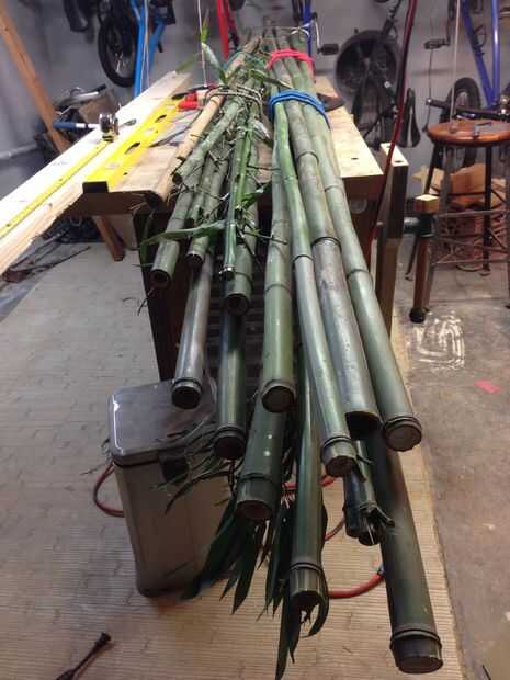 Bambú: Estaba todo listo para comprar postes de bambú de suministro de Frank a un costo de casi $200. Tengo mucha suerte y un vecino me presentó a alguien con un tortazo de bosque de bambú no deseados en el centro de la ciudad. He podido cosechar una buena selección de postes de hasta 40 mm de diámetro gratis! Lo hice en febrero, que fue agradable ya que hay una ventaja teórica a la cosecha de bambú en los meses más fríos. Coseché más de necesario porque no tenía ninguna manera de predecir cuántos pierdo a agrietarse durante el proceso de curado. Resulta que perdí muy pocos. Permite por lo menos 2-3 meses para curar, de lo contrario tus bastones se continúan reduciéndose después de no haber construido el cuadro - bueno. Los polos que en mi caso fueron los con curvas sexy en ellos - tipo de pena. Había curado mi polos por apilarlos horizontalmente en mi sótano con atención para maximizar el flujo de aire. Había convertido una vez después de 3 semanas. No me molesté en nodos de última hora y no me molesté con golpe incendiaron los polos porque encontre consejos contradictorios sobre el tema... Además, tenía también muchos polacos para hacer frente a.