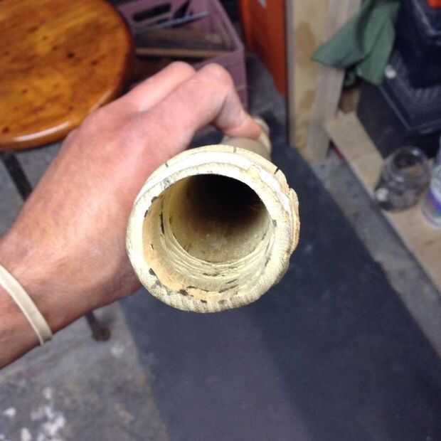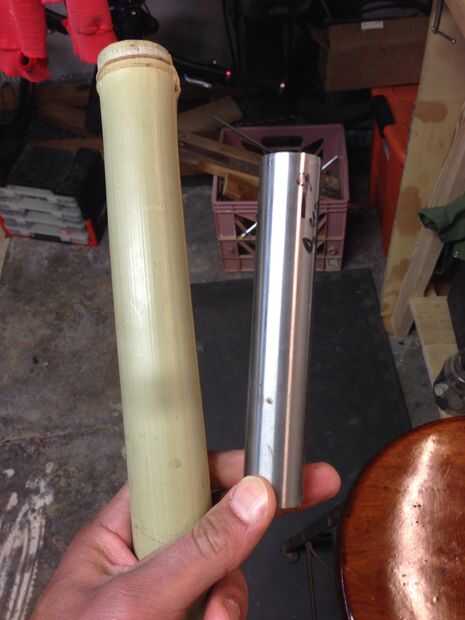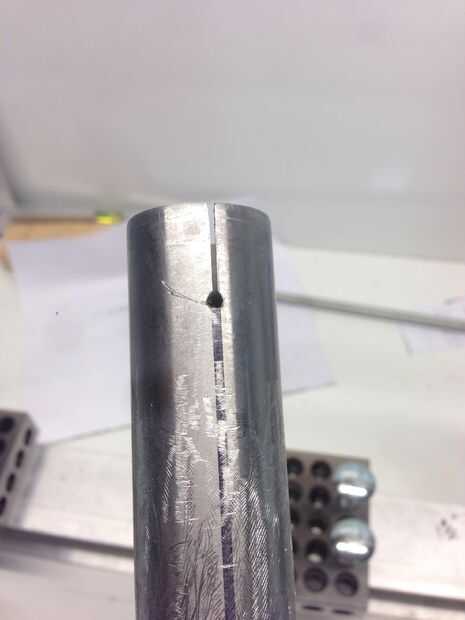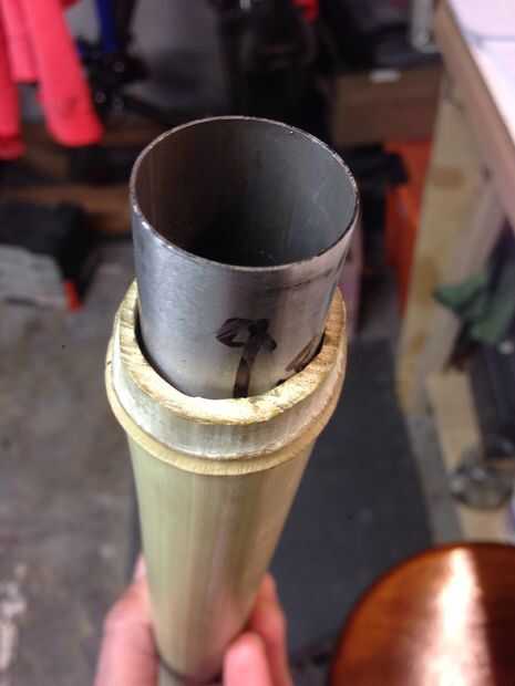 En este paso, primero seleccioné el polo recto que pude encontrar cuyo diámetro interno fue una estrecha para la inserción de tubo de asiento de metal que estaba usando. El polo que usaba tenía una cresta de un lado que requiere presentar suave hacia abajo. Me aseguré de que podría hundirse varias pulgadas de acero en el poste antes de cortar la pieza de inserción. Recuerde que sólo usted puede ajustar un extremo de la inserción del tubo de asiento! Así que marque cual es OK para cortar y que está bien de no hacer. Medida dos veces y corte una vez. La inserción fue adherida al polo con epoxi espesado un poco. Trate de vaciar el exceso de epoxy del extremo inferior de la estufa para asegurar que el poste del asiento se puede bajar más allá de la parte inferior de la inserción. Opté por un agujero y corte una ranura en la parte superior del inserto (para permitir la abrazadera del poste de asiento trabajar) antes de la adhesión, pero supongo que se podría haber hecho después de pegar también.