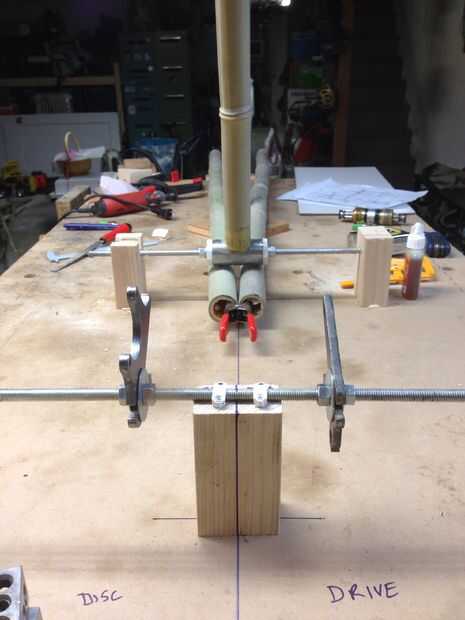 Una vez que se levantó el mástil de tubo de dirección, llegué a trabajar en un andamio de BB. Esto fue un poco de evolución, y así que me alegro utilicé madera - más fácil de modificar. Tuve el ST/BB rosca sobre una varilla larga. Esto se logró llevar la BB a una ferretería y comprobando todas las PVC tapas uno por uno hasta que encontré un par que calcen bien. Luego perforé un agujero a través de 3/8" el centro de cada uno - sitio web de Amy Qian (véase Introducción) describe una buena manera de hacer esto. Ahora pude montar el arreglo de BB ST en una varilla roscada, posteriormente suspendidos fuera de la mesa de trabajo en la altura apropiada para obtener la altura BB que estaba esperando en la moto definitiva. Yo finalmente muescas en uno de los miembros de puente ST BB por lo que pude quitar y reemplazar el BB ST según sea necesario mientras inhaladores y había afilado los tubos boom.