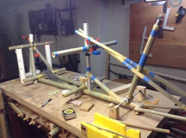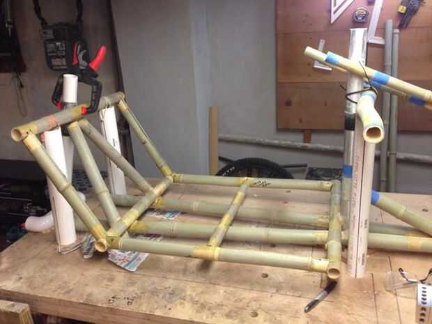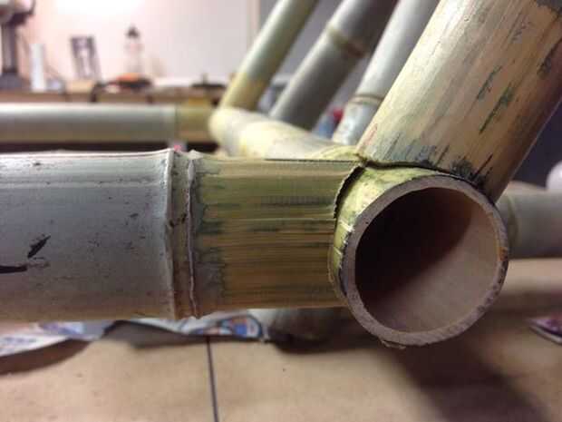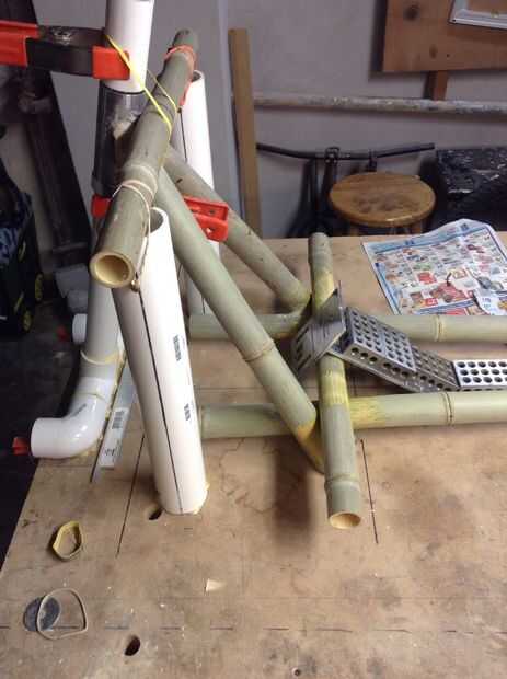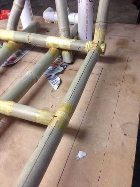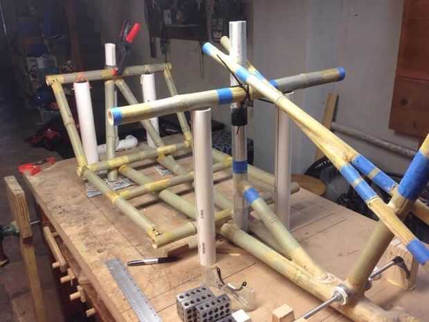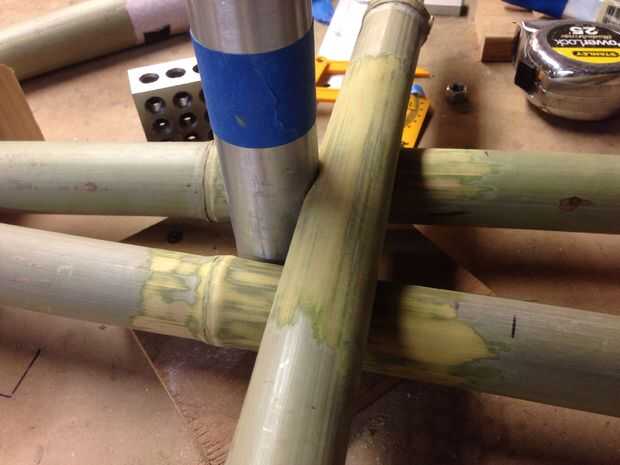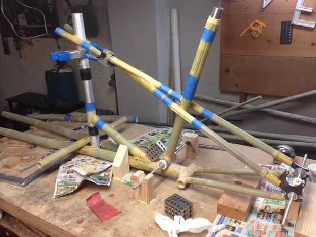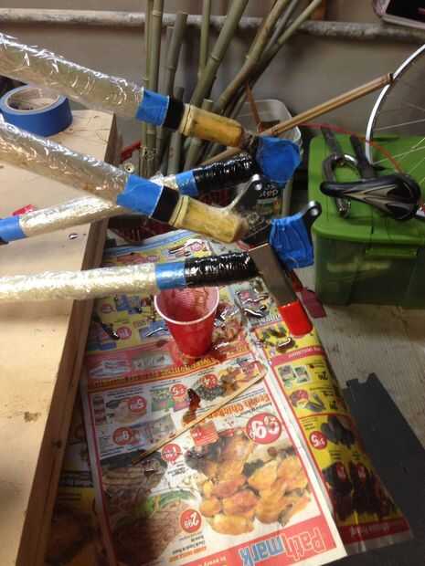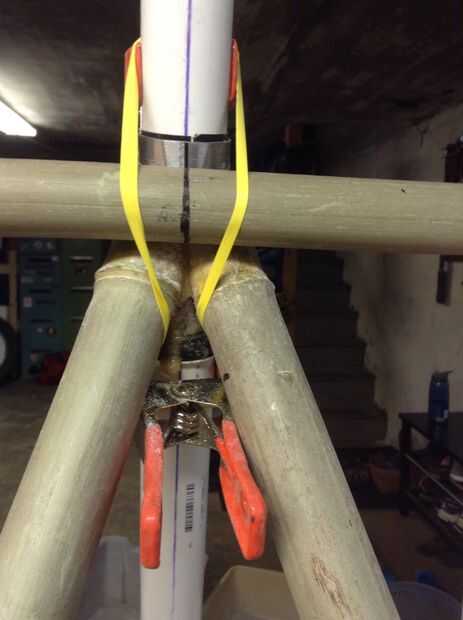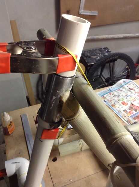 Después de que el auge tubo, triángulo trasero y delantero "triángulo" fueron pegadas para arriba, la estructura era lo suficientemente segura para retirarse el andamio. El andamio fue tomado y movido hacia atrás lo suficientemente lejos como para dejar espacio colocar el mástil de tubo en la parte delantera de la tabla. El buey tubo mástil/andamio roto en este punto, pero no es es gran cosa. El tubo de dirección estaba ya firmemente sujeta al larguero. Todavía necesitaba el mástil de tubo de dirección para realinear la estructura a la línea media, sin embargo. Una vez el andamio fue reposicionado y pegado encima, yo bien había afinado y doble comprobar la posición del mástil de tubo y la cabeza antes de pegar a la mesa así.