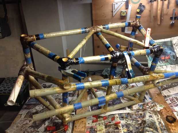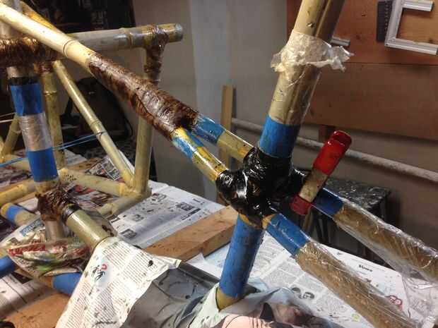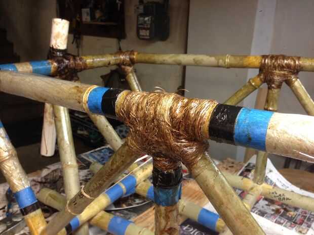 Envuelve las articulaciones era el siguiente paso. Esta fase del proyecto fue muy desordenada. He intentado enmascarar algunos de lo marco como un experimento. Me di cuenta que enmascarar realmente no ahorrarme cualquier tiempo, y no puedo recomendarlo. Es en esta fase que un proyecto como este se convierte en diferente de un proyecto de bicicleta de bambú normal. Había muchas juntas para gestionar. Empecé con las juntas no esenciales a trabajar fuera doblada en mi procedimiento de envoltura. Después de mucho ensayo y error colocaron en un sistema: