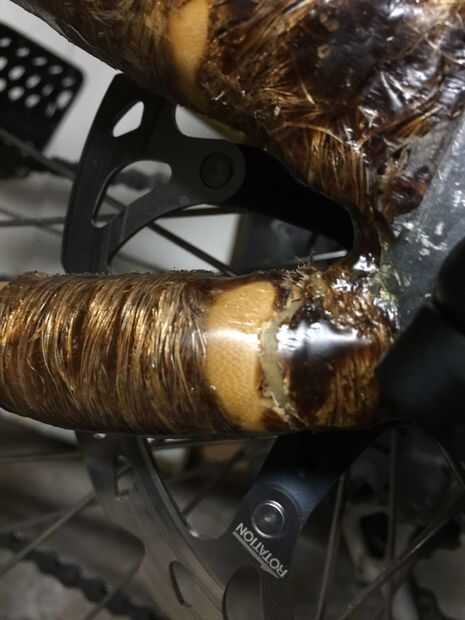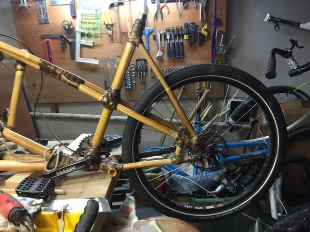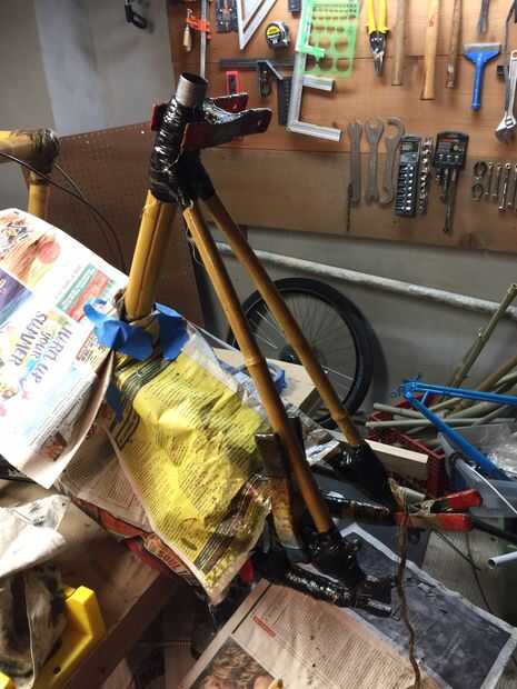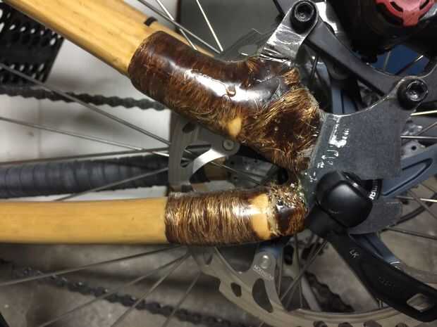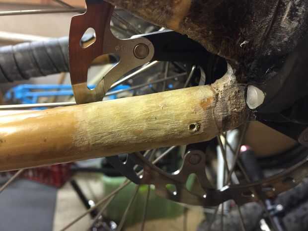 Después de unos meses de problemas liberan de montar a caballo, finalmente logró romper algo. Cogí un puñado de freno trasero durante una parada de pánico de baja velocidad, la bahía de carga esencialmente descargada, y oí un "crack". Esperaba era sólo mi rueda trasera deslizarse bajo frenadas, que ha sucedido antes (esto es el inconveniente del uso de salidas de pista estilo... ya que opté por ir con un cambio establecido y no un hub interno a, hubiera servido mejor con los brazos verticales). Después de reajustar la rueda trasera, descubrí que la rueda trasera ya no convertiría libremente porque ya no estaba en la alineación de la pinza de freno de disco. El sonido de "crack" fue una separación de la pata de lado del disco de la vaina (fotografiada arriba). Mi conjetura es que frenada contundente intenta girar a la puntera del disco hacia la izquierda. La deserción escolar es probablemente mejor apoyado en el sillín inserción debido a la forma de la puntera y el ángulo de la construcción, por lo tanto la fuerza resultante intenta extraer la puntera de la vaina. Alternativamente, la micro-movemement repetitiva de la deserción de disco causada flex en el triángulo trasero (gracias a las propiedades resistentes y perdonadores de los postes de bambú) que finalmente causó el tapón de abandono epoxi rígida en la caña de bambú para separar y no. No soy ningún ingeniero, así que sólo puedo adivinar.