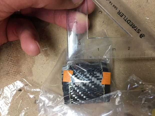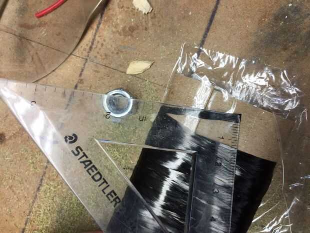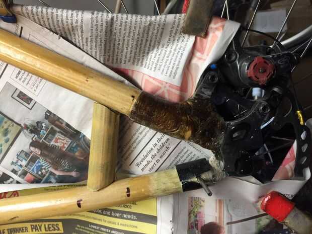 2. utilizar remolque CF y cinta adhesiva para a) sostenga la pata contra la vaina y b) Envuelva la vaina circunferencial para mantener el agujero de la división al final de la caña de bambú.