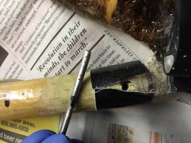 1. conducir un clavo de acero robusto a través de la vaina de lado disco y deserción para contrarrestar cualquier fuerza que trató de tirar de la pata de la poste (foto). He utilizado una sección de varilla de acero inoxidable recuperados las piezas aprovechables de un guardabarros SKS. Utiliza la rueda trasera en la puntera para aprovechar la pata Rajada en alineación, perforado pero la vaina y la deserción escolar (tamaño del orificio debe permitirle Deslice el pasador con la mano), y luego utilicé epoxi para fijar el perno en su lugar.
