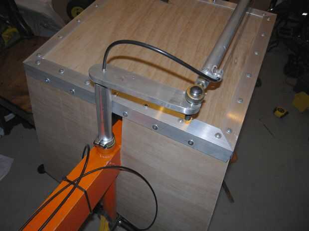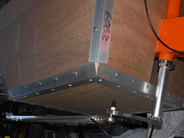 Una hoja de contrachapado fue con muescas para cuelgue de la viga principal y formar un nuevo, y una hoja fue nothced se deslizó por debajo de la viga principal en el frente para atornillar a la placa frontal. Entonces era sólo un caso de vinculación todos los costados y piso con ángulo. Porque ninguno de los ángulos eran 90degrees tenía que abrir cada pieza de ángulo por aplastamiento de la esquina de una barra de acero redondeada y el vice mandíbula.