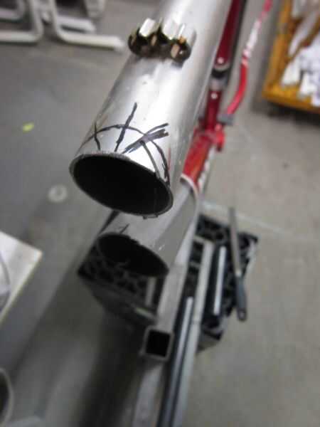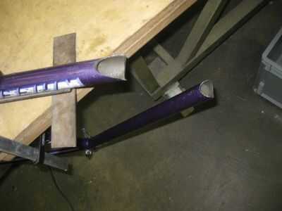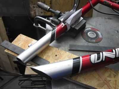 Aproximádamente un 39 cm del eje de centro (soporte de bb o inferior) hacemos un corte en 90° con una cegueta. Cortamos los dos tubos, tanto el viene del asiento, como el que va del BB al telescopio.
