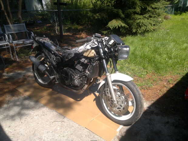 Es una bicicleta de carrera ex 1993. Tiene un extremo delantero FZR600 y un basculante de 1986 ZX6 con una rueda trasera FZR600 18". El dueño anterior perdió la titularidad y la moto no estaba funcionando cuando lo conseguí, pero sería inestable. Era un poco un lío, pero acabé consiguiendo la propiedad para él y comenzó el proceso de reconstrucción.