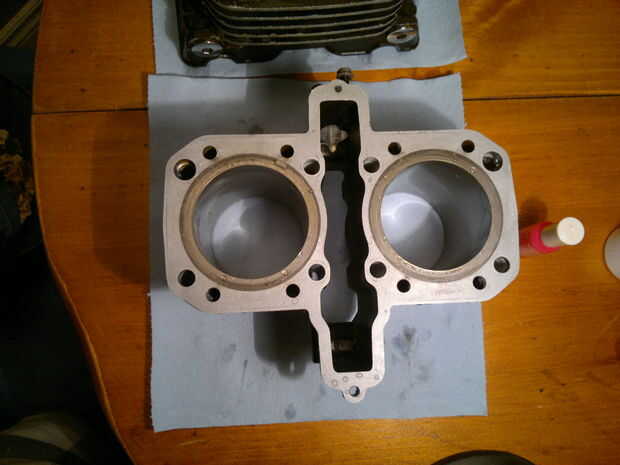 Traslapar implica el uso de un compuesto de pulido (pasta abrasiva) para traer las holguras entre piezas a espec. Para el cilindro y la cabeza utilicé un pedazo grande de granito de desecho ($5 desde un instalador superior contador) con un trozo de cristal en la parte superior (lo más que pude encontrar dentro de presupuesto). Apliqué el compuesto a la placa de vidrio y utiliza como mi superficie pulido. Supone mantener presión uniforme en la parte que estás trabajando y moverse en un patrón de figura 8.