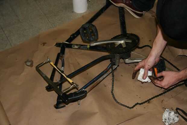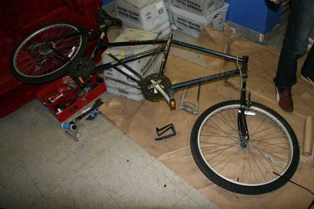 DELANTERA bicicleta: Retire la rueda trasera y todo el equipo de engranaje cambiante. Ahora que sierra para metales de los tubos de soporte para la rueda trasera como se muestra en la segunda imagen - queremos que la parte inferior izquierda de tubos en pero sin los soportes de rueda y queremos los tubos superiores completamente ido.
