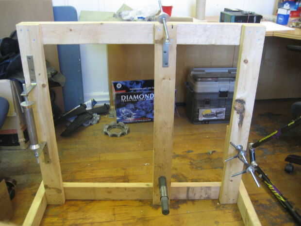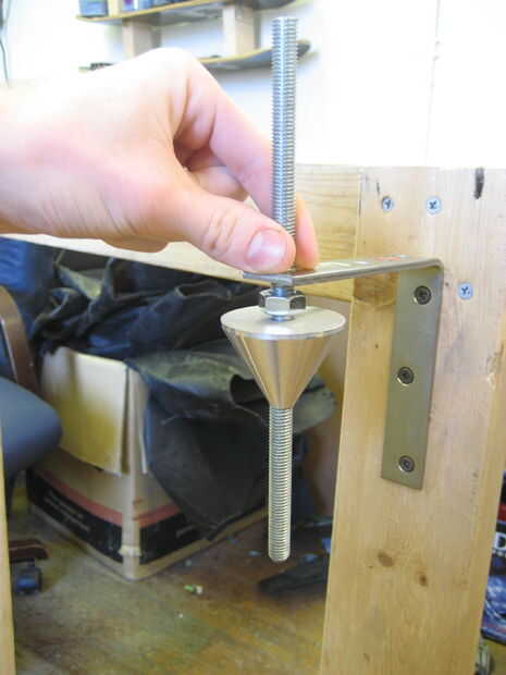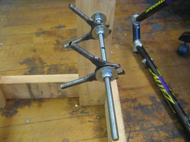 Hay 3 2x4s verticales que sujetan el tubo de dirección, tubo del asiento, pedalier y punteras. Hay una segunda pieza de 2 x 4 en la parte trasera donde va el agujero del soporte inferior y donde va el agujero posterior deserción escolar. Tengo las medidas de un viejo marco de la bici. los conos fueron hechos en un torno de culata de aluminio, rosca un agujero en ellas para no tener que utilizar más las tuercas de fijación. Taladré un agujero para el mandril de shell de soporte inferior con una sierra (necesita un ajuste apretado para que no se mueva), el pvc fue rechazado de 1,5 pulgadas para que el soporte inferior a encajar. El droputs encaja muy bien en la varilla M10. Me perforó un agujero a través de 2x4s para la barra y una arandela y una tuerca de fijación en ambos lados. las punteras están aseguradas con una arandela y una tuerca en cada lado. Sigamos hacerle bicicletas a actualizar la plantilla de aluminio extruido, así puedo hacer diferentes tamaños.