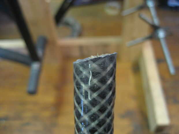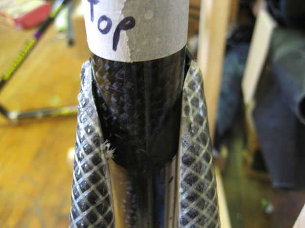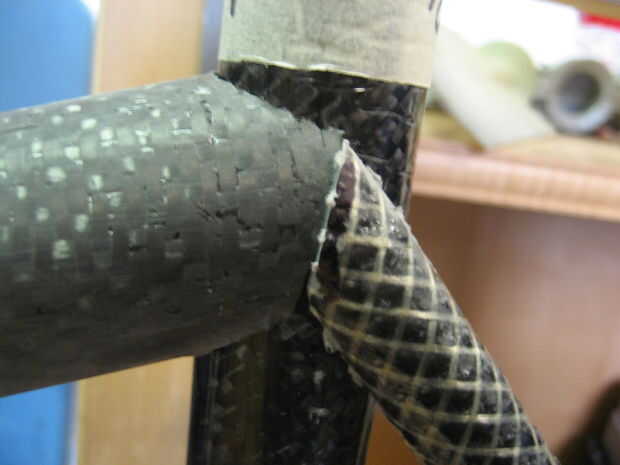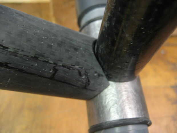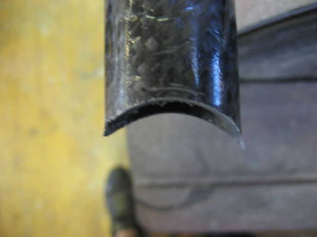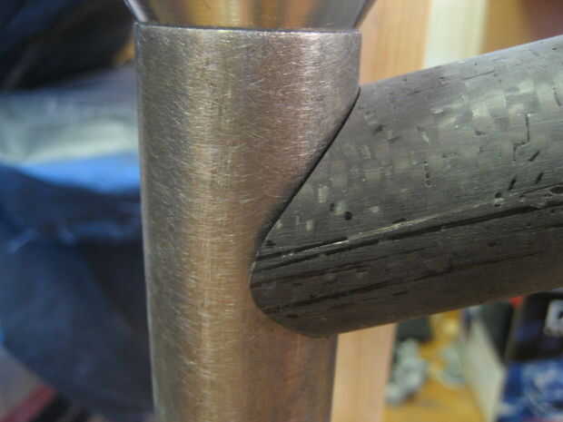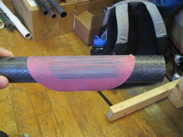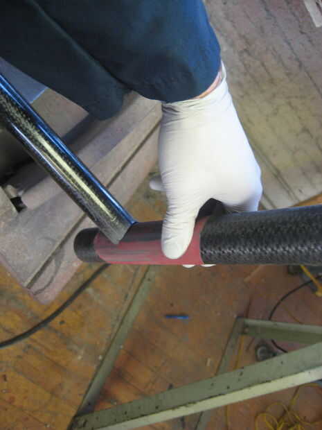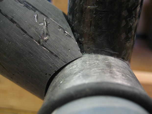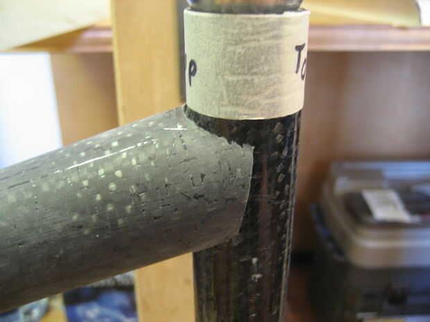Usé un taladro con una sierra (uso de una sierra cerca del mismo tamaño que el tubo se muesca en) para hacer un corte áspero en los tubos luego utilizan otro tubo con papel de lija envuelto en él hacerlo entallado final. Polvo de fibra de carbono es nocivo si se inhala mucho. Ropa seguridad (respirador, gafas, longsleeves). Si consigues el polvo en su piel empezará a picar muy malo, rayar, es peor. se va finalmente pero si su ropa toca el área afectada te volverá loco.