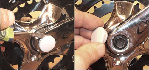 Los brazos de manivela de manivelas Three-piece set se sujetan a un eje por un tornillo a través de los centros. Como se muestra en la figura 11, la pequeña tapa de plástico debe de quitar para llegar a este perno. Si la tapa es ranurada, se Desenrosque con una gran cabeza plana Destornillador. Si es sólo una tapa, luego sáquelo con un destornillador.